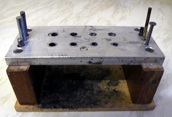 There are some standbys that are unique to the pen mechanic, though, and the knock-out block is one of them. Over the years I’ve had three. The first one was a simple wood block with a metal top and various sizes of holes drilled through. It worked but it wasn’t very stable. I then got one of the cylindrical metal type. Better, but still not what I wanted – it was too small and fussy. Then an older restorer retired from the craft and sold off a mountain of tools and spares which I managed to snag. Among them was this knock-out block: