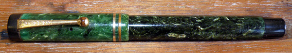 I have read that the Duofold Special, or JL (for Junior Long) as it’s also known, was not listed in Parker’s catalogues of the time, but was made to meet popular demand for a Duofold the length of the Senior and the thickness of the Junior. Actually, it’s a tiny bit shorter than the Senior and a little thicker than the Junior – but near enough! From the first black hard rubber model in 1922 the Special was very popular in Britain, and survives in moderately high numbers. This two-ring green jade version was made in 1928 and 1929, and is not so often seen.