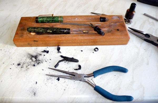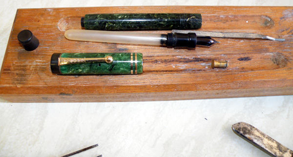 There’s a routine to restoring a pen – assess, disassemble, clean, assess again, re-assemble. The only part that needs replaced here is the sac. I use a silicone one to prevent any further discolouration of the jade. It’s important to clean the inside of the barrel thoroughly; any fragment of the old latex sac that remains will continue to discolour the barrel. As it’s a screw-in section, sac size is critical. It has to be as large as possible to contain the optimum amount of ink, but narrow enough to clear the walls of the barrel. Then it’s time for reassembly and a gentle polish, and the pen is ready for write-testing.