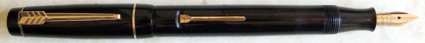 Croxleys were only made for a short period and the product range is small. The earliest one I have seen is very much an example of the Standard British Pen (of which more on another occasion), straight-sided with a large BHR clip-screw, a ball-ended clip and a straight lever, looking very much like a Summit or a Mentmore Autoflow. The Croxley most usually seen is quite similar, but it has a handsome arrow clip which is echoed by an arrow-shaped lever. A balance-shaped pen with a smoothly curved clip and an arrow lever was also made. The pens come in black and the usual range of marbled patterns. There is also a plain-but-handsome desk-set which turns up once in a blue moon.