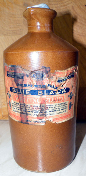 How old would you say that stoneware ink bottle is? I can’t say, though I do know that they were in use from around 1860, and might have continued to be made as late as 1950. What I can tell you is that there is blue/black ink in there that’s still perfectly usable! Though the label is damaged it can be seen that this ink was made by Stephens, and I would guess that it was probably a school ink bottle. They’re moderately common.