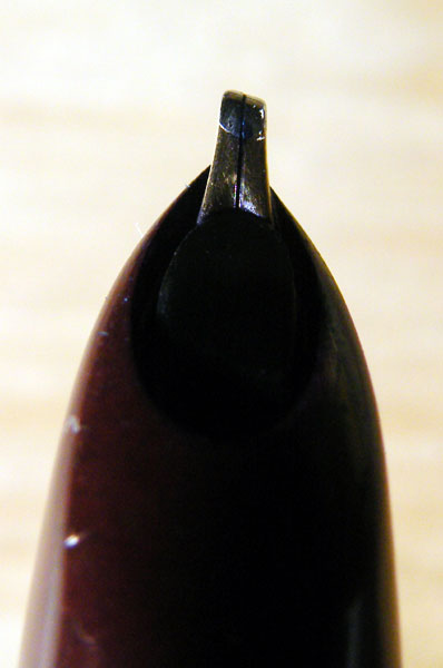 I have several objections to the Parker 51, and some of those would apply to the 61, the 21 and the various clones made by other manufacturers. First off, I dislike hooded nibs. Much of the beauty of a fountain pen, for me, lies in a well-designed exposed nib. Also, I dislike pens that taper towards the writing point. It feels like your fingers are slipping forward all the time, and it forces a strong and ultimately painful grip. This is a problem common to all pens of that shape, especially Parker’s flighter ballpoints. It’s possible to create a tapered pen with a good grip, like, for instance, the Sheaffer Balance. The Parker 51 is just plain ergonomically wrong.