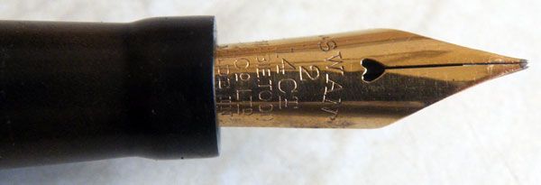 Both as a repairer and a writer, Swans are my first choice of pen, and of all the Swans, I like Minors, whether SM1 or SM2, best of all. They’re an adequate size and the design is very pleasing, with the flat-topped (or in this case very slightly domed) cap, the inserted clip and the hard rubber lever, which breaks up the line of the barrel much less than the usual metal one. And then there’s the nibs… Minors almost always have exceptional nibs. Far more often than in any other model, Minors have oblique, stub or very flexible nibs. Perhaps it was the real “writer’s pen” of the Swan range. I haven’t tested this pen yet, but it seems to be at least semi-flexible.