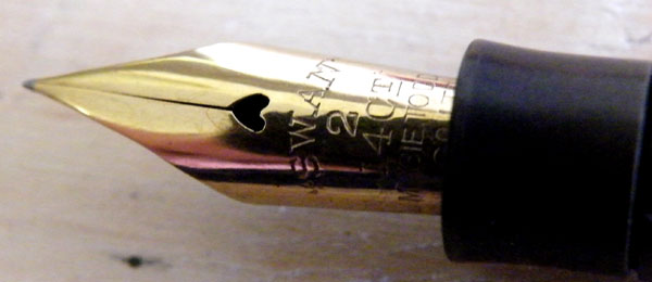 When I think of Swans, this is the pen that comes to mind. This is THE Swan for me, the epitome of the brand. The SF230 also came in mottled hard rubber and, a little later, in a variety of celluloid patterns including green jade and lapis lazuli. They are very attractive, but the black hard rubber version is the one that works best for me, as there’s nothing to distract from the splendid design. It’s a big pen -17.5cm posted – and it’s designed to impress, with its three bands and large gold-filled clip. It isn’t the most expensive pen in the range. There were very highly-priced overlay pens, pens with very much larger nibs – this has a No2 – and the ETN range with their Eternal nibs was higher priced.