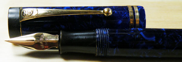 This is a Macniven and Cameron Waverley 308. It ticks just about all the Duofold boxes – size, proportion, milled clip screw, cap ring placement, even a Duofold-type blind cap on a pen that doesn’t need one because it’s a lever filler. Closed, it’s almost a lapis lazuli two ring Duofold of around 1928. Once you see the nib, of course, the game is up!