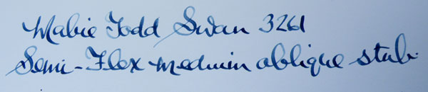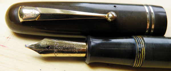 This is a 1940s black hard rubber pen, and with a No2 nib and two narrow cap rings it wouldn’t have been very expensive. The BHR has faded quite evenly, to a pleasing chocolate brown but otherwise the pen’s pretty much as new. The high-shouldered medium oblique nib is very attractive. That said, it’s a fairly ordinary pen that isn’t likely to draw admiring attention. The line it produces, though, is the picture of elegance: