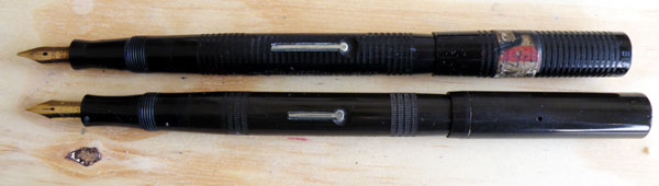 Here are two Mabie Todd lever-fillers in black chased hard rubber, one a Blackbird, the other a Jackdaw. Neither was assigned a model number and they’re the same length and thickness to the millimetre. The Blackbird’s cap tapers a little more than the Jackdaw’s and there’s less chasing on the Jackdaw. The Jackdaw has an unusually short lever. They’re both from the period around 1914-25, and are clipless, as was often the case in those days. We tend to think of the clip as an essential part of the pen but it wasn’t always seen that way. In advertisements as late as 1928, Conway Stewart made much of the fact that their washer-clips were easily removed!