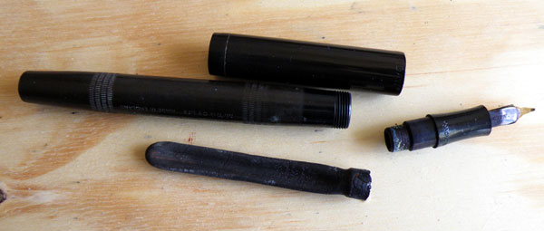 Neither of these pens shows much wear. The Blackbird still has its original sticker. It’s hard to read now, but it looks like the pen cost seven shillings and three pence new. The Jackdaw’s nib has been replaced with a Blackbird one at some time.