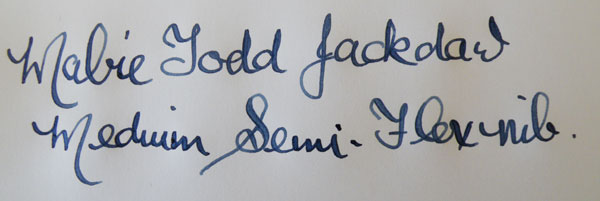 Swans, and all the other Jackdaws and Blackbirds I’ve seen, have ladder feeds. These two pens don’t. In both cases, the visible face of the feed is smoothly curved. They’re not spoon feeds, like a Waterman, either. They simply have feed channels, and, as such, are decidedly primitive feeds. They’re not replacements, as they’re marked “Blackbird” and “Jackdaw”. I re-sacced and tested the Jackdaw, and the ink supply kept up with a generous semi-flex medium nib very well.
