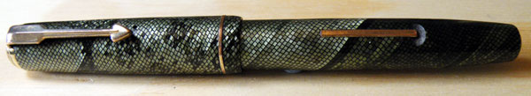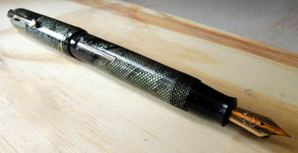 National Security pens appear in some striking celluloid patterns: turquoise and gold, lapis lazuli, snakeskin and lizard-skin. This lever filler is an example of the latter pattern.