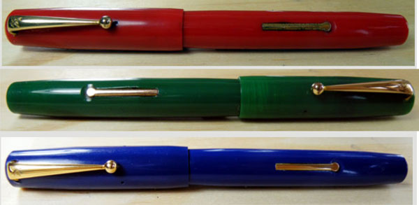 The bright self-coloured red, blue and green pens are deceptively modern-looking, and at a glance one might take them for a seventies rather than a thirties pen. The dates usually assigned to these pens are 1936 to 1938. Either they sold very well in those three years or they remained in production longer, as these pens are very common. No doubt they were well-priced to meet the reduced spending power in the Hungry Thirties and were a success, especially as a school pen. They were built to a price, and unusually for Mabie Todd pens, they can suffer from barrel or cap distortion. Nonetheless, a good one (and they’re mostly good, despite slightly wonky barrels) is a great daily user. The nibs are often flexible, from slight to considerable in degree.