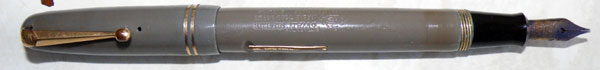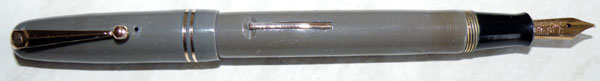 Grey is an unfortunate colour for fountain pens. It discolours, almost always. The pre-war celluloid grey/black marbles didn’t show the yellowing quite so much, and even when it did, the marbling reduced the unpleasantness of the effect. In the post-war period there was a fashion for self-coloured pens. Quite a few manufacturers, including Mabie Todd, Parker and Wyvern had self-coloured model ranges in the late forties and early fifties. All included grey as one of their colours, and all dropped it quite quickly and reduced the range to the burgundies, blues, greens and blacks that retained their original colours. Small wonder, because the self-coloured greys invariably discoloured, often very badly.