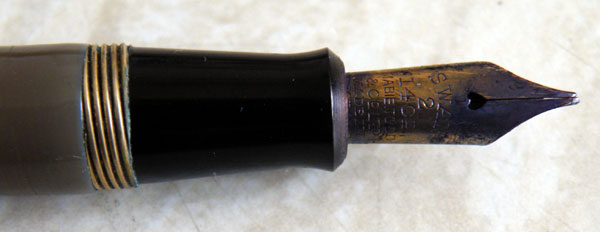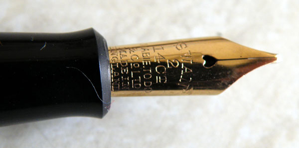 This is a Swan 3230, made between 1947 and 1950. Mabie Todd was still a maker of very high quality pens in this period, though I think the gold plating on these pens is thinner than it would have been fifteen or twenty years earlier, and there has been some plating loss on this example. It’s a well-made pen, though, comfortable and well-balanced in the hand – a real writer’s pen. The stubbish nib is a medium oblique. The pen is, of course, discoloured, with an obvious difference between the cap and the barrel. It’s by no means the worst I’ve seen – these pens can become a hideous muddy yellow.
