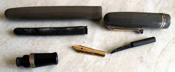 Like black pens, grey pens are often cannibalised to provide spares for more colourful pens that will sell for a higher price. That’s something I try to avoid. True, if a pen is extremely discoloured to the point where it looks repulsive, I’ll strip it for spares but otherwise I’ll repair it. After all, they’re not making any more 60-year-old Swans, and these pens are splendid writers. I’m not in the business of reducing the numbers available. Yes, it may sell for rather less than a more a colourful one but I didn’t pay much for it and it didn’t take a lot of my time to put it right. It’s not going to have collectors fighting over it, but someone who wants a thoroughly excellent writer and doesn’t care too much about its appearance will treasure this pen.