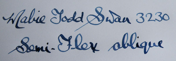 Though it confers no obvious benefit, Mabie Todd went to the added expense of threading the sections of these pens, rather than making them a press fit. The brass threads and the two cap rings place this pen in the middle of the price range. As always with Swans, it’s an easy repair and it’s the work of a matter of minutes to return the pen to working condition. I pop in a silicon sac to prevent further discolouration. When tested, the nib is decidedly flexible. It’s a real pleasure to write with.