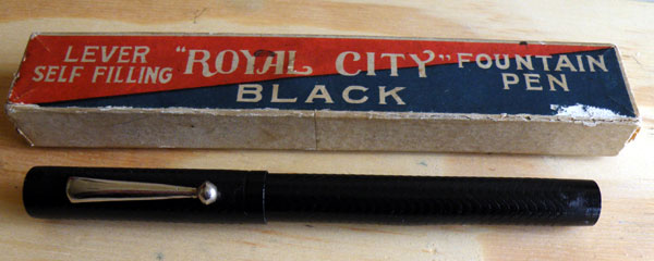 The pen has no barrel or cap imprint but the word “foreign” is stamped on the lever. In those protectionist days, such a label doubtless had tariff implications that escape me, but it does narrow the field a little. Most imports were marked with their country of origin, like “Made in Germany” or “Swiss Made” for instance. Then there was “Empire Made” or “Commonwealth Made” which implied Hong Kong or India, among others. This elimination doesn’t leave many other countries that were capable of mass production in the nineteen-thirties, so I think we may assume Japan to be the most likely source of this pen. Maybe it’s a stretch, but I think that “Royal City” sounds like the kind of appellation that would have seemed dignified and impressive in Japanese but loses something in translation and becomes meaningless in a British context.