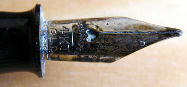The pen could date as early as the late twenties, but I suspect that it’s later. Makers of cheap pens were often conservative in their designs, and this pen is about as cheap as pens of that period get. That said, it probably worked well enough when it was new. The nib is actually tipped rather than having a doubled-over end, as you see on many very cheap nibs. It was gold plated, though most of the gold-wash has gone. It’s marked “Warranted 14k Gold”, with the additional and important word “plated” sneakily hidden under the section. This was a trick that manufacturers of low-cost pens used extensively in the USA, but I don’t think this pen’s American.