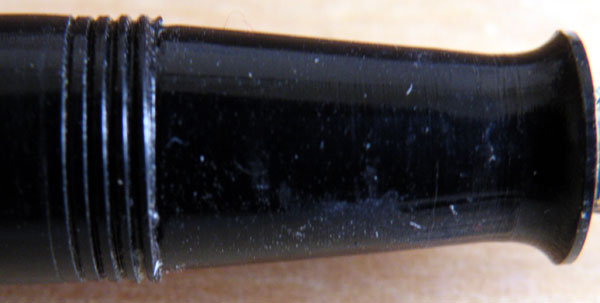 The pen is made from, I think, chased black plastic, rather than hard rubber. It shows little signs of use, but there is swelling of the barrel and the lever cut-out gapes. Either the threads are poorly cut or there is shrinkage of the barrel, as the cap doesn’t fit well. There’s no inner cap, so the nib would have tended to dry out and there was the possibility of leakage. To top it all, the pen was made in such a way that it cannot be taken apart to replace the sac.