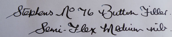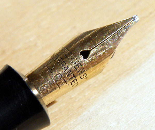 The nibs in Stephens pens may bear the company name or just be warranted 14ct gold. Both appear to be original. In general, they have some flexibility and are often broad.
