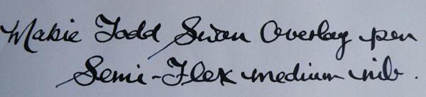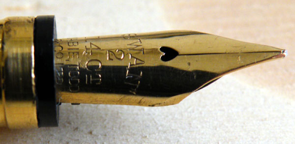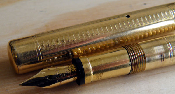 After hunting around on the web for comparable examples, I came to the conclusion that this pen was made in the early nineteen-thirties. In style, it’s conservative and even retro, for its time, being clipless and built on an ageing pen model. It shows slight signs of wear here and there – where the cap screws onto the barrel and on the lever, but it’s generally in excellent condition. The nib is quite flexible and the pen writes beautifully.