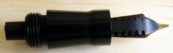 It works in the same way as a traditional eyedropper, but Swan have been quite bold with the design. The thread that seals the barrel full of ink is barely a third as long as a First World War eyedropper’s would have been, but to compensate those threads are extremely deeply cut. It works; the pen is completely ink-tight. All in all, though it’s an example of Swan’s last production, it’s a well-made pen.