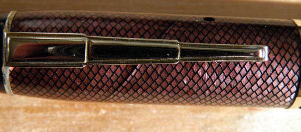 This pattern, in various forms, appears on several makes of pen: Swans, Blackbirds, Summits and Wyverns to name but a few from the British manufacturers. It’s sometimes called brickwork, I’ve seen some American collectors describe it as web, and here it’s mostly known as lizardskin. The fact that the pattern varies from dark to light is, I think, meant to evoke reptile skin. Here, it’s at an angle, whereas on Swans it tends to run parallel to the pen. I think this is because, rather than being machined from the rod, this cap and barrel are made from wrapped celluloid sheet. The pattern ran along the sheet, but the forming of the pen has set it at an angle.