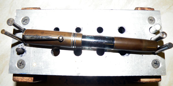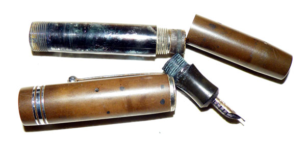 That decidedly ugly thing on my knock-out block is a no-name bulb-filler in hard rubber. It was sold as a Mentmore because it happened to have a tiny Mentmore nib in it. In all respects, it’s identical to National Security bulb-fillers I’ve had before. They were made, I believe, by Henry Stark, Son & Hamilton and that’s the likely source of this pen too. I love bulb-fillers and I haven’t repaired one this year, so I grabbed it despite its sad condition. It cost very little, you’ll be relieved to hear.