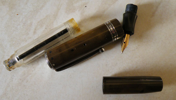 Here it is disassembled. Really, that’s the worst part over. I never know what these ink-view barrels are made of. Might be celluloid or some form of perspex, but they’re often very fragile, just awaiting the slightest pressure to be applied in unscrewing the nib/section unit to crack and break into a thousand pieces and bring the restoration to a sad end. This one was quite sound, though, and disassembly was tense but uneventful. Dry heat and infinite patience is the recipe for success.