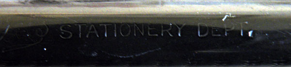 It’s clear that it was a company pen because the faint imprint “Stationery Dept.” can be seen in this enhanced photo (Thank you, Photoshop). I suppose it was available for everyone to fill out their stationery requisitions – a far cry from today’s attitudes, where it’s believed that lending your pen to someone else will irretrievably damage it. Of course, everyone knew how to write with a fountain pen back then, unlike today. Perhaps the clip was left off to make it less likely that someone would slip it into their pocket.