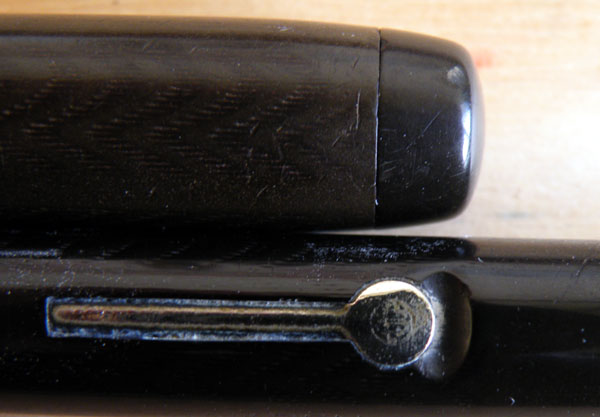 Judging by the tiny shield on the lever, this is one of the earliest ones. The chasing is shallower than it once was but it’s still there. The pen has no clip, and it doesn’t look like it ever had one – Conway Stewart made quite a feature of the “with or without clip” prices, and even of the fact that their clips could be easily removed.