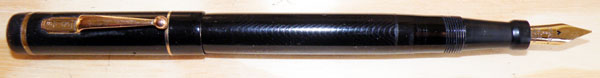 This no-number Leverless looks to me to be one of the earliest, so it probably dates to about 1933. It’s a big pen: 13.5cm capped and a very long 17cm posted. These pens had quite a few price gradations and this one isn’t at the top of the scale, having only one narrow cap ring and a medium-sized No3 nib. It’s a serious and imposing pen, all the same. It has survived the passage of time well. There’s some fading of the black hard rubber cap top and turn-button.