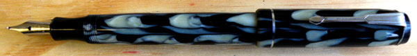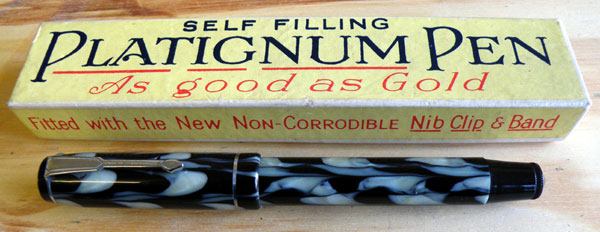 This pattern is called “Black and Pearl”. The “As good as gold” tag that you see on the box dates back to the 1920s, when Platignum was born as an offshoot of Mentmore. It was the company’s assertion that their steel nibs were as good as anyone else’s gold ones, a claim you don’t really have to believe. That’s not to say that they didn’t make many good pens. It was really only in the post-war period that some of their lower-priced pens went from economical to downright cheap.