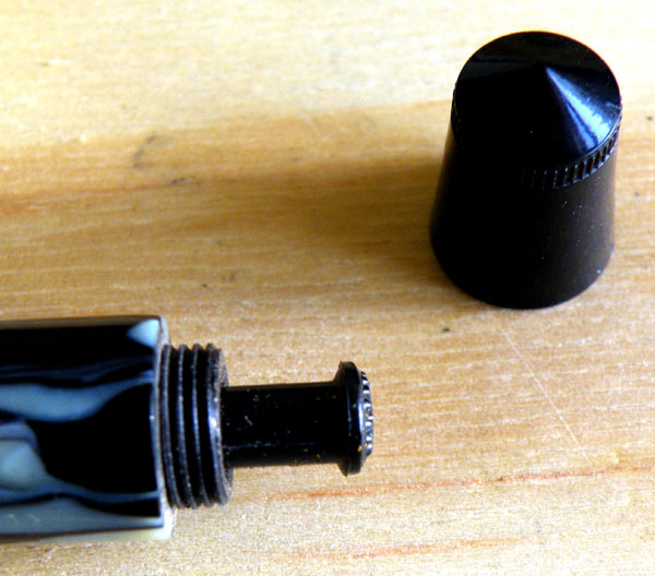 This one’s quite a well-made pen. It uses Mentmore’s patented screw-in plastic button and Platignum button fillers are efficient. I haven’t tested its writing abilities yet, but if previous Platignum steel nibs I’ve tried are anything to go by, it will write perfectly well, provided you don’t want too much in the way of character from your nib. These spoon-ended nibs have a shorter life than a properly tipped nib, but as most people don’t use their pens very much nowadays that’s no longer as important as it once was. In any case, I suspect that this pen will be bought more for its appearance than for its utility.