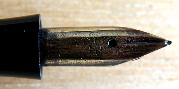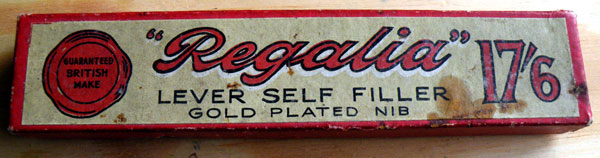 The second thing that’s a little strange is the price. This is, I should think, a nineteen-twenties pen. By a stretch, and allowing for the most backward-looking of conservative design, it might creep into the thirties, but I doubt it. At that time, 17/6d was a lot of money. In 1928 you could buy a high-in-the-range Conway Stewart 212 with two gold-filled barrel bands for 12/6d (Oh, how I want a time machine!). The Regalia isn’t at the top of any range – everything about it says “cheap pen”. The metal trim has at best a gold-wash. The nib is plated, or once was. The design is two tubes, one large enough to screw onto the other, and the barrel end is threaded. That’s pretty crude. Despite being quite a good idea, the barrel end thread is practically diagnostic of cheap pens. Even by the end of the thirties, 17/6d was still the price of a luxury pen, a cracked-ice Duro-nibbed Conway Stewart 1203, for instance. So I can’t really explain the price, unless maybe you got a small car free when you bought it.