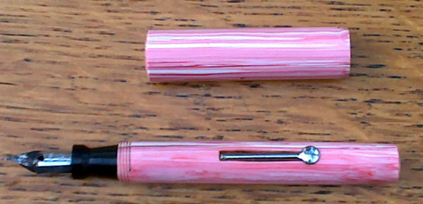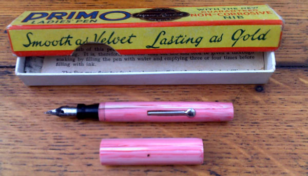 The pen is essentially two tubes, one of greater diameter than the other. That design, also used for the Conway Stewart Dinkies and the small Rosemary pens dates it to around 1930. The box, with its various fonts and its seal is a masterpiece of graphic design and the style coincides with that date. The manufacturers made a virtue of necessity in asserting that their “non-corrosive” nib is “as lasting as gold,” a claim similar to that made for the new Platignum range of pens around the same time. With its simple, clean lines and shocking striated pink, the Primo Dainty holds its own with its Rosemary and Conway Stewart competitors, even though it has a steel nib as against their gold ones.