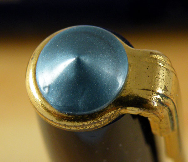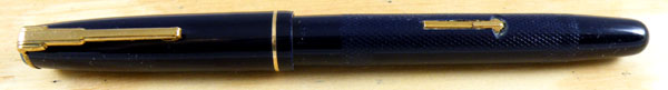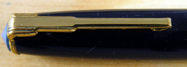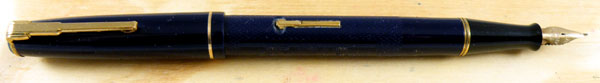 This midnight blue pen is a mixture of tradition and innovation. The pen closes with a clutch rather than screwing shut and the bright blue clip stud is shared with other very late M&C pens. On the other hand, the leaf-shaped nib harks back to the early days of the company and the stepped clip is in the Art Deco style, quite an anachronism by the post-war period.