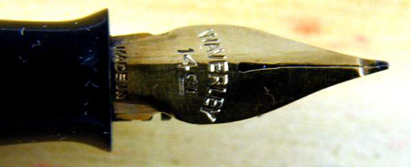 I used to think that Macniven & Cameron were the only manufacturers who made the leaf-shaped nib, but not so. Perry had one in the twenties and there was the strangely-named Gaynor Swas-Tika, a very high quality pen whose spear-shaped nib had a bar over the top to reduce drying out of the ink. Lastly, I have a similar no-name one. There was a fashion for these nibs, it seems, but they all died away, leaving Macniven & Cameron to produce the last version, probably in this pen.