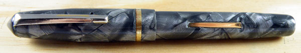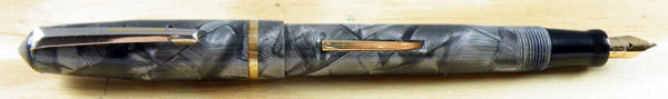 But look at that pattern! It may be wrapped celluloid sheet rather than machined from the rod as would have been the way in earlier days, but Unique is far from unique (oh stop it!) in that cheese-paring saving. Such highly respected manufacturers as Conway Stewart and Valentine did it, too. Unique, it has to be said, has done it rather well. Putting the pattern on the slant looks very good, and what a pattern it is, somehow combining both marbling and hatching. Also, there is no sign of the unfortunate delaminating that so often afflicts Valentines made by this method, and sometimes even Conway Stewarts.