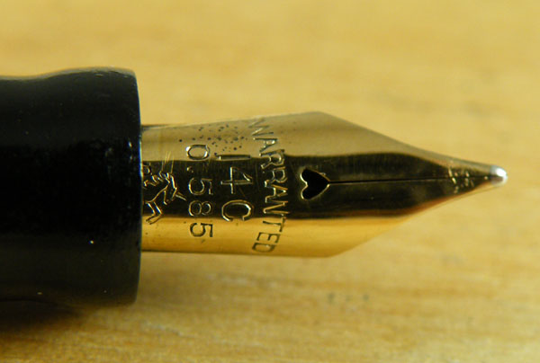I don’t suppose that this was an expensive pen, and no more was spent on fripperies like gold plating or 14 carat gold than was absolutely necessary. In other words, the trim has a gold wash and the nib is quite small. In reality, of course, the only bit of the nib that does any work for you isn’t made of gold and it’s that little grey bit at the tip, so the size of the nib is much less to do with practicality than with bling. The gold wash, sadly, is another matter. It is disappointing that such an otherwise beautiful pen should be spoiled for what must have been comparatively little outlay. There’s an element of “the ship was lost for a ha’pworth of tar” here. However, the gold has lasted on the lever and the cap band and the clip is not unpleasant to look at, being bright and shiny though devoid of any hint of gold.