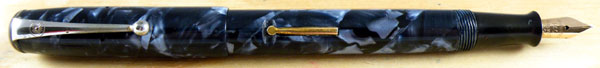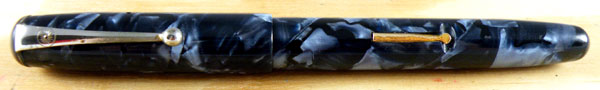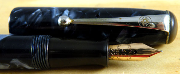 These pens with black ends are among the best of the non-Onoto output. They’re really well made, and so they’re a pleasure to restore. This one needed a new sac and a polish. That was it, and ready to go again. The black ends are memorable, in that the one at the base of the barrel is a piece of black celluloid grafted on to the patterned barrel, in much the way that Waterman and Mentmore did. Waterman’s and Mentmore’s examples generally ended in disaster with the ends cracking, fragmenting and falling off. I’ve never seen that happen to a De La Rue Pen. The other end, the top of the cap, is a shallow-domed clip screw made out of black hard rubber. Most have faded to brown now, so the black ends effect is a little spoiled.