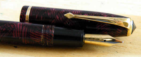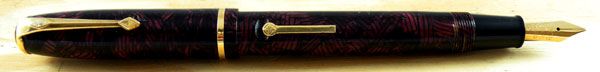 This is the burgundy or plum hatched variety of the 28. Plum seems more appropriate to me. The hatch is a beautiful pattern but the red versions are often faded by now. The visible areas look a little dull and there’s a sliver of the original brightness hiding under the cap. This one’s completely unfaded and presents the original glory of the pattern.