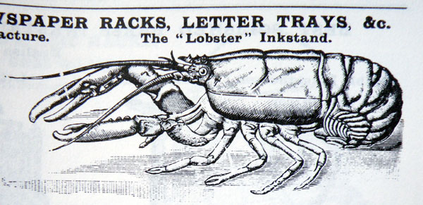 However, if you didn’t trust these new-fangled fountain pens and decided to stick with your dip pen, you could buy a nice polished brass lobster ink-stand: