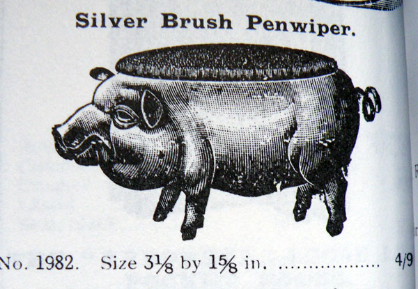 But if the lobster ink-stand made you shiver with revulsion, how about this cute piggy pen-wiper for only four shillings and ninepence?