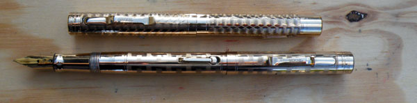 Recently somebody was selling off their collection of overlay and metal bodied pens and I bought a few of them. These are the shorter Wahl Gold-Filled pens, measuring 10.8cm (41/2 inches). They were made between 1920 and 1929, the height of the Art Deco period, and these are often called Wahl Art Deco Pens. That’s odd, in a way, because there’s no individual feature of these pens that relates to the Art Deco Style. They’re restrained and symmetrical. The machined decoration on one – the Greek Key Pattern – is entirely classical in origin and the other, the Diamond Wave Pattern, is without any obvious influence. The overall effect, though, with the shapely clips and the tiny, decorative levers, is, perhaps, slightly Art Deco Mild, as it were, and the fact that the patterning is machined rather than hand-engraved as it would have been in an earlier era, adds to this.