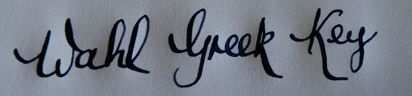 These are quite practical pens. Capped, they’re no longer short at 14.8cm, which is an average size for a pen. Both have the excellent Wahl 3 nib. The Diamond Wave patterned one is semi-flexible, but the Greek Key pattern is fully flexible. Both are a delight to write with. There’s a little loss of plating where the pens have been posted, but at 80 – 90 years old they’re as pretty and useful as when they were made.