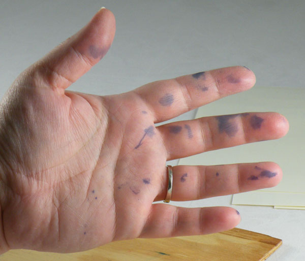 On another topic, ink’s a useful substance in the bottle or the pen or on paper but anywhere else it’s a messy nuisance. Handling pens all day as I do, there are plenty of opportunities to get inked, so I glove up to work on pens and even to do writing samples. Now, it seems, I need to put on gloves to open the mail: