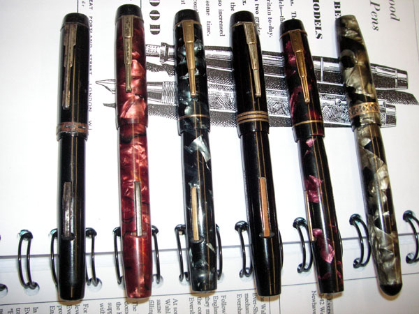 Among the lever-fillers there are some that I haven’t seen before, notably the burgundy marble with no cap ring and the black three-ring example. It would be useful to establish a time-line for all of these pens but it’s a bit beyond me. I’d hazard a guess that the pen on the extreme right, missing its clip and with a pierced cap band, is later than the rest. It’s quite a common pen and I’ve had a few examples in different colours. Simon believes this pen was made by Unique.