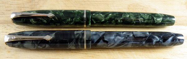 That looks like one of those puzzle pictures – “Is one of these things bigger than the other or is it an optical illusion?” Actually, they’re the same size and they’re Conway Stewart 75s. Though it’s not depicted here, there is a slightly shorter 75, and even a bandless one. Judging by the frequency with which it appears in eBay, the 75 may well have been Conway Stewart’s most popular post-war model. It was inexpensive, mostly because the trim was chrome plated instead of gold plated. In 1955, when the 60 cost three pounds and six shillings, and the popular 27 cost one pound six shillings and sixpence, the 75 retailed at a mere seventeen shillings including purchase tax. As the build quality was as good as that of the bigger, more expensive pens and the nib is comparatively large, this made the 75 a good deal back in the nineteen-fifties, and it still is.