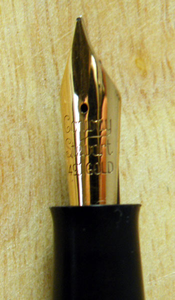 This was meant to be a clever side-by-side photo of the two 75 nibs but one was out of focus, blast it, so you only get one! That’s an elegantly-shaped CS 3 nib, if you think of the broad, short 84 nib, or the narrow, somewhat wraparound nib of the 55 for comparison. That’s just about the way a fountain pen nib should look!