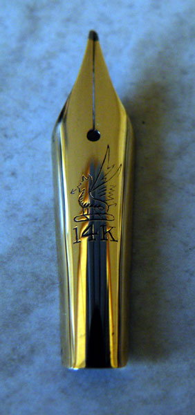 This nib belongs to a fairly shabby blue marbled Wyvern 60C. I haven’t tested it yet but it seems to me I detect some flex there, and a flexible Wyvern nib is one of the best you’ll get.